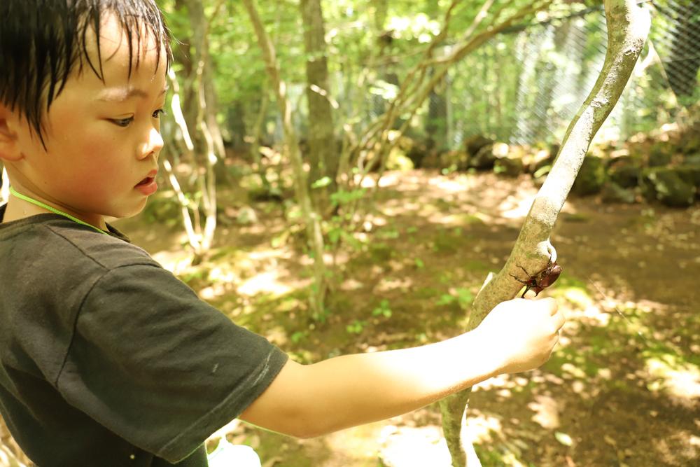 木の幹や切り株の陰など様々な場所に隠れてるカブトムシを捕まえて虫かごに入れて持ち帰りましょう。