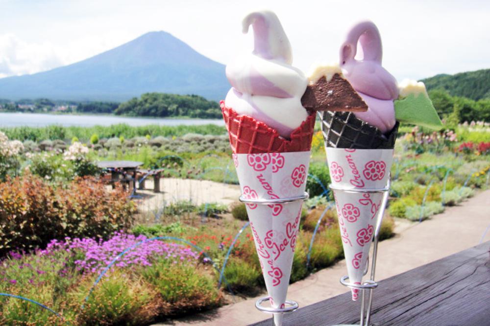 河口湖周辺で富士山を望む絶景とともに楽しめるのが、個性豊かなソフトクリーム。ソフトクリームを手に湖畔を散策する観光客の姿をよく見かけます。