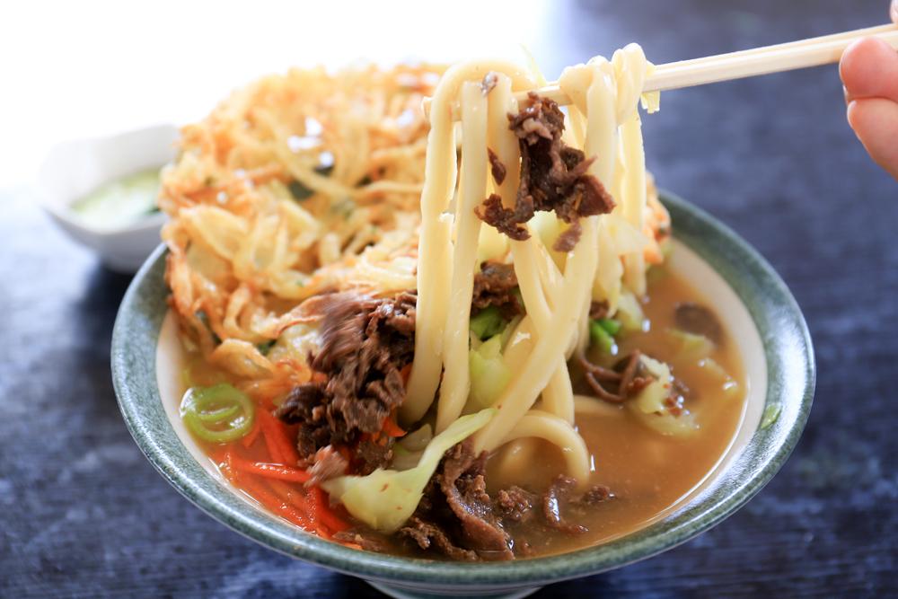 富士吉田市のソウルフード「吉田のうどん」。太くて弾力のある麺と、馬肉やキャベツをのせた素朴な味わいが特徴です。