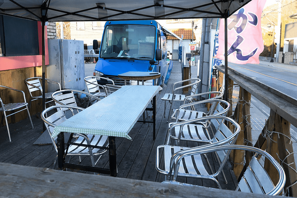 スーパーの前にはキッチンカー専用のテーブル席も10席ほど用意されており、ゆっくりと食事を楽しむこともできます。