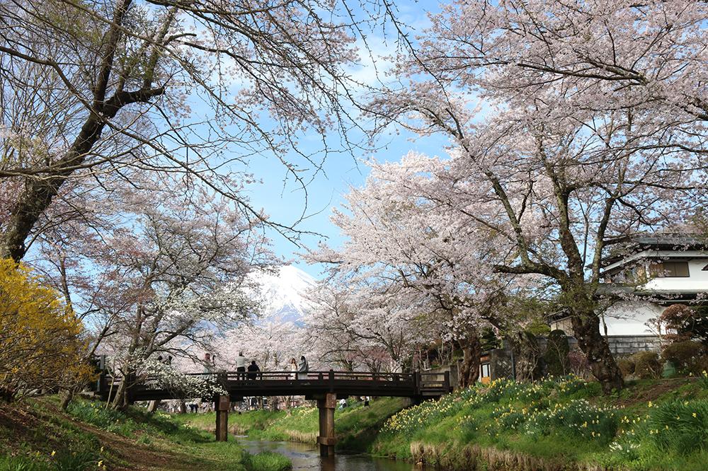 新名庄川沿いには、約400mの桜並木が続いています。忍野お宮橋からこの桜並木を眺めると、川の両岸に咲く桜の間から富士山が顔をのぞかせる美しい景色を楽しめます。