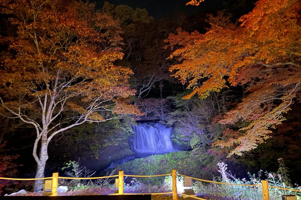 ライトアップされた滝やいろはもみじの回廊を見ながら心静かなひと時を