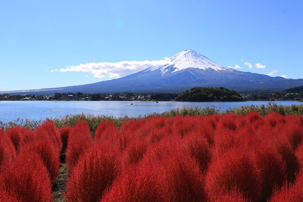 また、もみじやイチョウの紅葉は11月に入ってから見頃を迎えますが、河口湖の北岸にある「大石公園」ではコキアの紅葉を楽しむことができます。コキアの紅葉はモミジよりも早く、10月中旬~下旬頃に見頃を迎えますので、こちらもあわせて楽しんではいかがでしょうか。